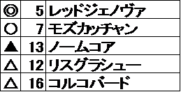 〇7モズカッチャンはドバイ帰りの前走は直線後方からの鋭い伸びで成長を証明している。府中牝馬Sの回避で調整がどうかという部分だけが不安材料。逆転も可能で連覇を目指す。